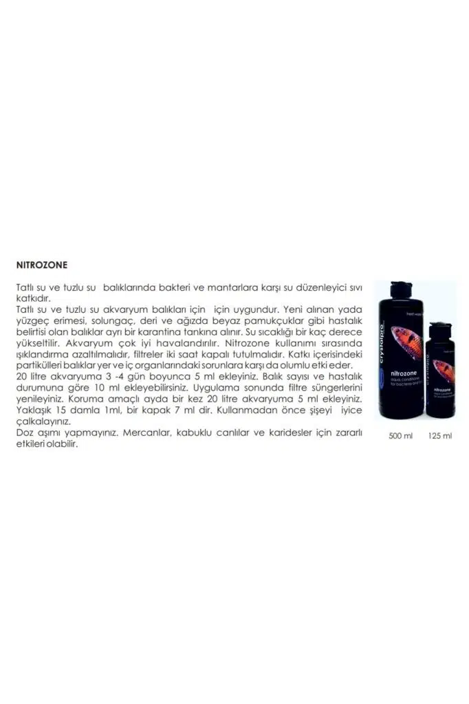 Nitrozone Mantar Ve Bakterie Ilacı 125ml Tatlı su ve tuzlu su balıklarında bakteri ve mantarlara karşı su düzenleyici sıvıkatkıdır.Tatlı su ve tuzlu su akvaryum balıkları için için uygundur. Yeni alınan yadayüzgeç erimesi, solungaç, deri ve ağızda beyaz pamukçuklar gibi hastalıkbelirtisi olan balıklar ayrı bir karantina tankına alınır. Su sıcaklığı bir kaç dereceyükseltilir. Akvaryum çok iyi havalandırılır. Nitrozone kullanımı sırasındaışıklandırma azaltılmalıdır, filtreler iki saat kapalı tutulmalıdır. Katkı içerisindekipartikülleri balıklar yer ve iç organlarındaki sorunlara karşı da olumlu etki eder.20 litre akvaryuma 3 -4 gün boyunca 5 ml ekleyiniz. Balık sayısı ve hastalıkdurumuna göre 10 ml ekleyebilirsiniz. Uygulama sonunda filtre süngerleriniyenileyiniz. Koruma amaçlı ayda bir kez 20 litre akvaryuma 5 ml ekleyiniz.Yaklaşık 15 damla 1ml, bir kapak 7 ml dir. Kullanmadan önce şişeyi iyiceçalkalayınız.Doz aşımı yapmayınız. Mercanlar, kabuklu canlılar ve karidesler için zararlıetkileri olabilir.500 ml 125 ml