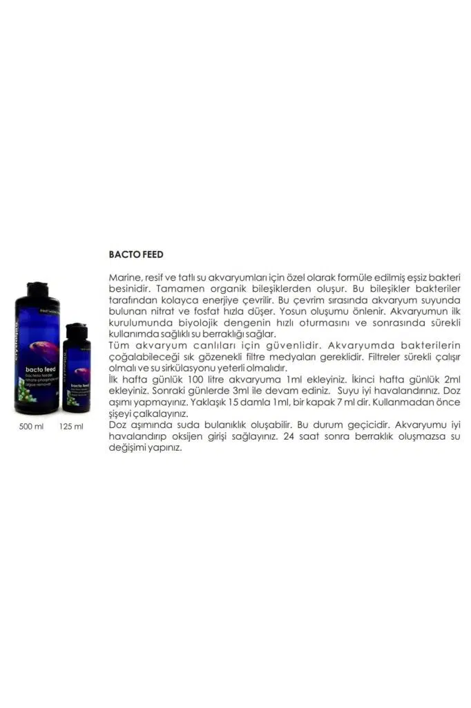 Crystalpro Bacto Feed Akvaryum Bakteri Kültürü Destekleyici 500 Ml Marine, resif ve tatlı su akvaryumları için özel olarak formüle edilmiş eşsiz bakteribesinidir. Tamamen organik bileşiklerden oluşur. Bu bileşikler bakterilertarafından kolayca enerjiye çevrilir. Bu çevrim sırasında akvaryum suyundabulunan nitrat ve fosfat hızla düşer. Yosun oluşumu önlenir. Akvaryumun ilkkurulumunda biyolojik dengenin hızlı oturmasını ve sonrasında süreklikullanımda sağlıklı su berraklığı sağlar.Tüm akvaryum canlıları için güvenlidir. Akvaryumda bakterilerinçoğalabileceği sık gözenekli filtre medyaları gereklidir. Filtreler sürekli çalışırolmalı ve su sirkülasyonu yeterli olmalıdır.İlk hafta günlük 100 litre akvaryuma 1ml ekleyiniz. İkinci hafta günlük 2mlekleyiniz. Sonraki günlerde 3ml ile devam ediniz. Suyu iyi havalandırınız. Dozaşımı yapmayınız. Yaklaşık 15 damla 1ml, bir kapak 7 ml dir. Kullanmadan önceşişeyi çalkalayınız.Doz aşımında suda bulanıklık oluşabilir. Bu durum geçicidir. Akvaryumu iyihavalandırıp oksijen girişi sağlayınız. 24 saat sonra berraklık oluşmazsa sudeğişimi yapınız.