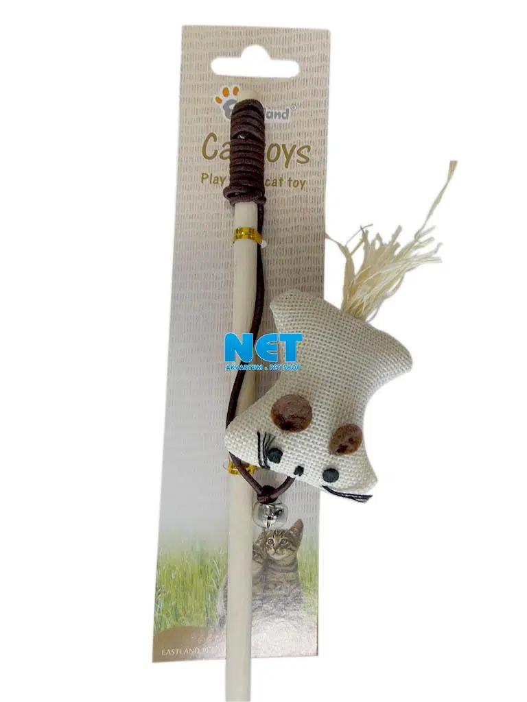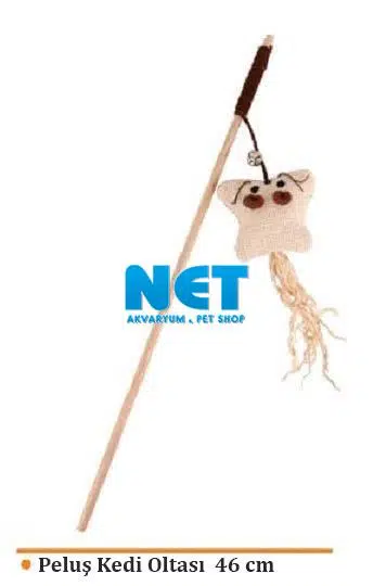40 cm uzunluğunda sopaya bağlanmış 55 cm uzunluğunda esnek ipin ucunda 6 x 6 cm hasır peluş fare ve çıngırak olan Kedi Oltası