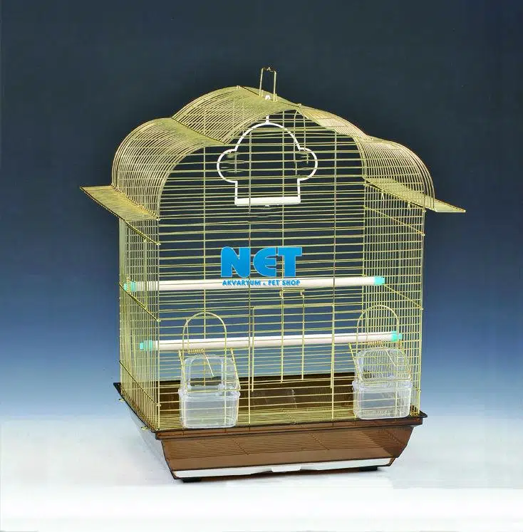 Kanarya ve muhabbet kuşları için, pirinç telli ve renkli plastik alt tabanı bulunan, ön ve yan tarafta olmak üzere iki kapılı, çıkarılabilen beyaz renkte tepsili ve pirinç telli, ızgaralı kafes.