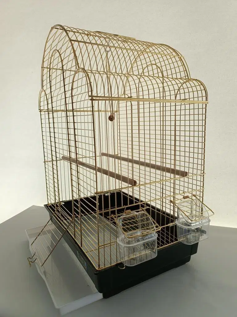 Papağanlar ve paraketler için, beyaz telli, tabanı ızgaralı ve tepsisi çıkarılarak kolayca temizlenebilen kafes.