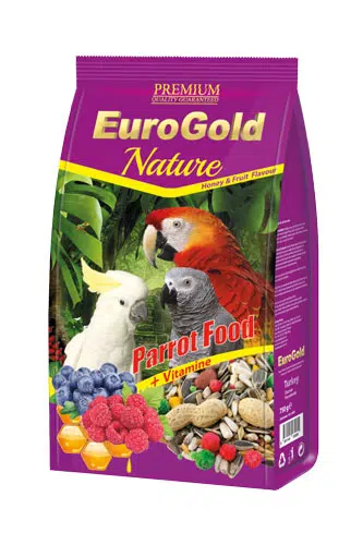 Papağanların, doğal beslenme alışkanlıklarına uygun olarak hazırlanmış tam yemdir. Bu karışım, en kaliteli tohumların özenle seçilerek harmanlanmasından elde edilmiştir. Papağanınızın ihtiyacı olan tüm besin maddelerini içeren tam yemdir. EuroGold papağan yemi içeriğindeki bal ve meyve aromaları ile yem yemede isteksiz kuşların bile severek yiyebileceği bir yemdir. İçerik; buğday, arpa, yulaf (mevsimsel), mısır, beyaz sorgum, kırmızı sorgum, ay çekirdeği (Dakota), aspir, fıstık, vitamin-mineral karışımı, bal ve meyve aromaları.