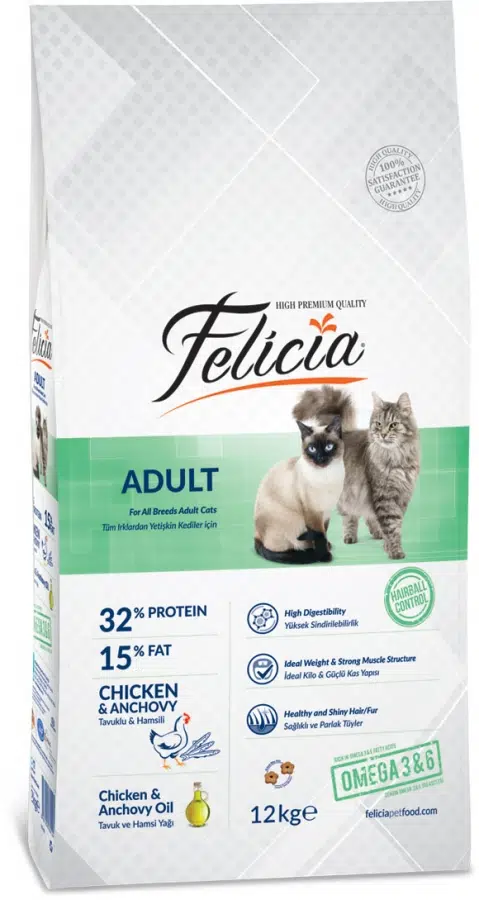 Felicia® Adult Cat Tavuklu ve Hamsili kedinizin ihtiyacı olan günlük tüm besinleri tam ve dengeli olarak alabilmesi için kedi & köpek beslenme uzmanları tarafından en kaliteli içerikler kullanılarak özenle formüle edilmiştir. Titizlikle seçilmiş hammaddeleri ile böbrek sağlığını ve sindirim sistemini destekleyen maddeler içermesine özellikle önem gösterilmiştir.