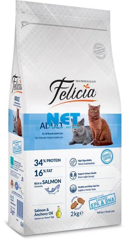 Felicia® Adult Cat Somonlu kedinizin ihtiyacı olan günlük tüm besinleri tam ve dengeli olarak alabilmesi için kedi & köpek beslenme uzmanları tarafından en kaliteli içerikler kullanılarak özenle formüle edilmiştir. Titizlikle seçilmiş hammaddeleri ile böbrek sağlığını ve sindirim sistemini destekleyen maddeler içermesine özellikle önem gösterilmiştir.