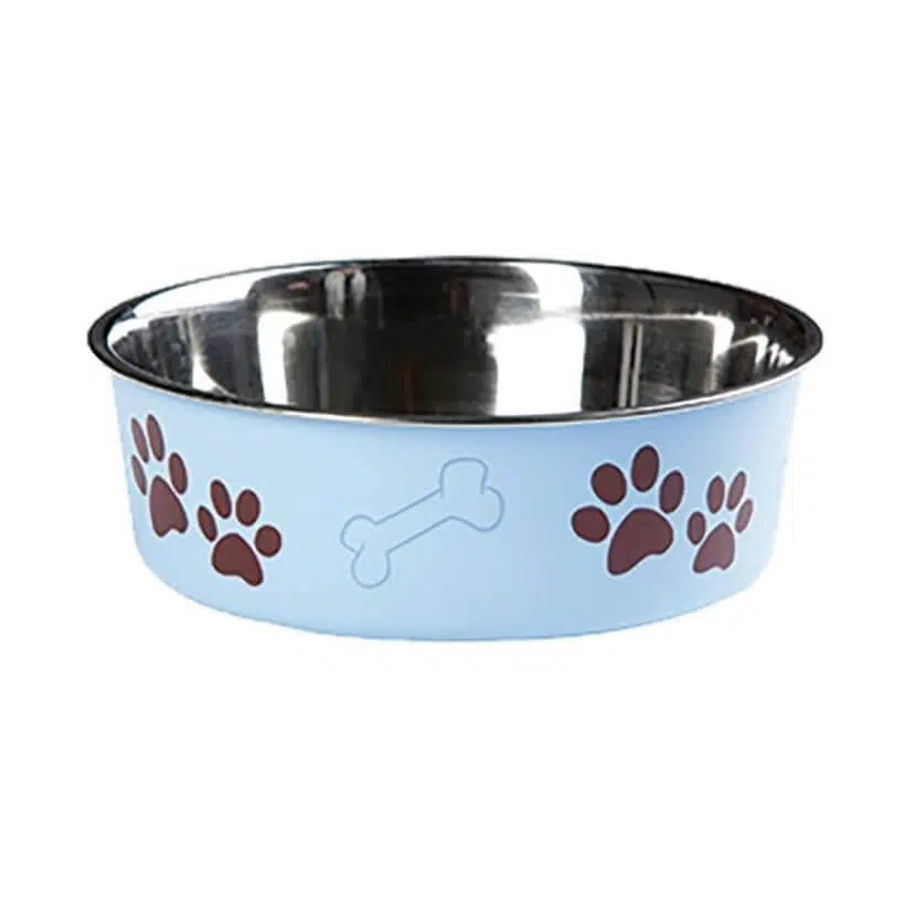 Pati ve kemik motifli paslanmaz çelik mama ve su kabı.