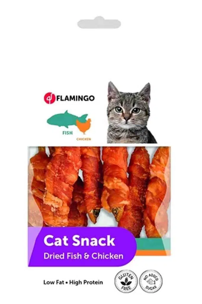 Flamingo hapki kurutulmuş balık ve tavuklu kedi ödül maması; Kediler için tamamlayıcı lezzetli ödül mamasıdır. İçeriğinde kurutulmuş balık ve tavuk eti bulunmaktadır. Kedi ödülü; Glüten ve şeker içermez.