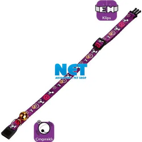 Fare desenli, dayanıklı, naylon kedi tasması. 30 cm uzunluk, 10 mm genişlik. Mor. Tasmayla uyumlu renkte çıngırağı vardır.