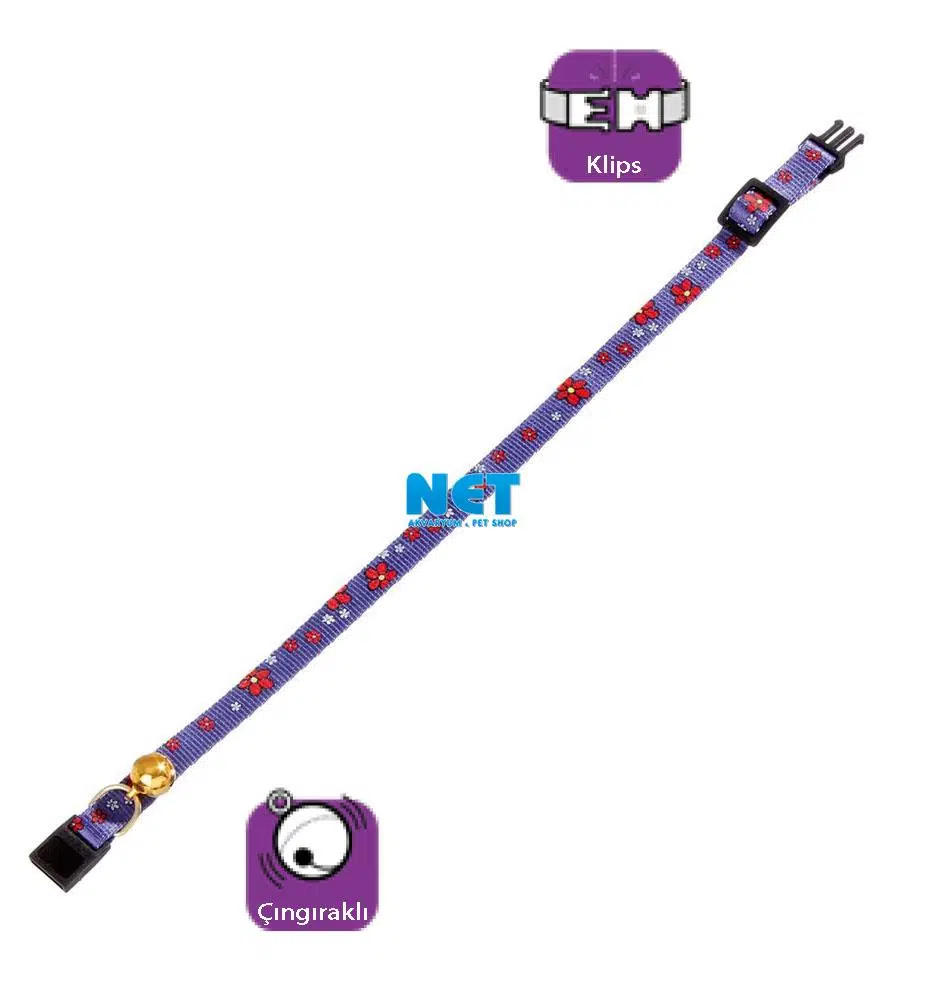 Çiçek desenli naylon kedi boyun tasması. Çıngıraklı. 30 cm uzunluk. 10 mm genişlik. Mavi
