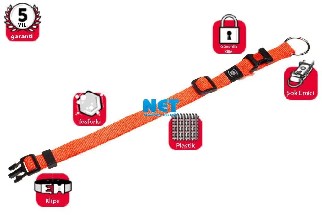 Gerginliği önleyici, dayanıklı naylon malzemeden, metal kısımları krom kaplama boyun tasması. 45-65 cm uzunluk. 25 mm genişlik. L boy. Turuncu