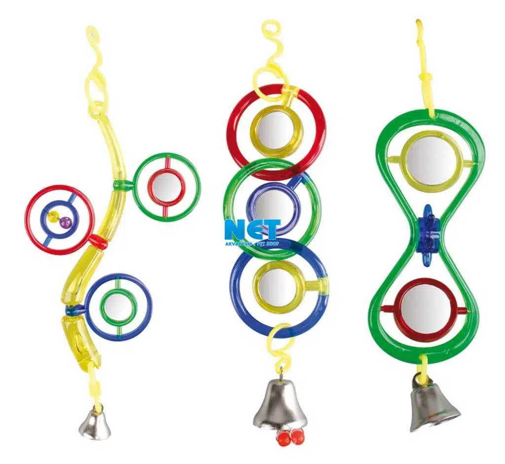 KUŞLAR İÇİN PLASTİK ÇERÇEVELİ, AYNALI VE ÇINGIRAKLI OYUNCAK. GENİŞLİK 5 CM. YÜKSEKLİK 15 CM.