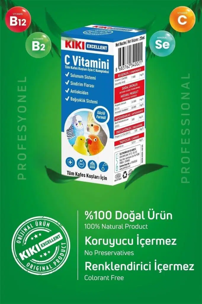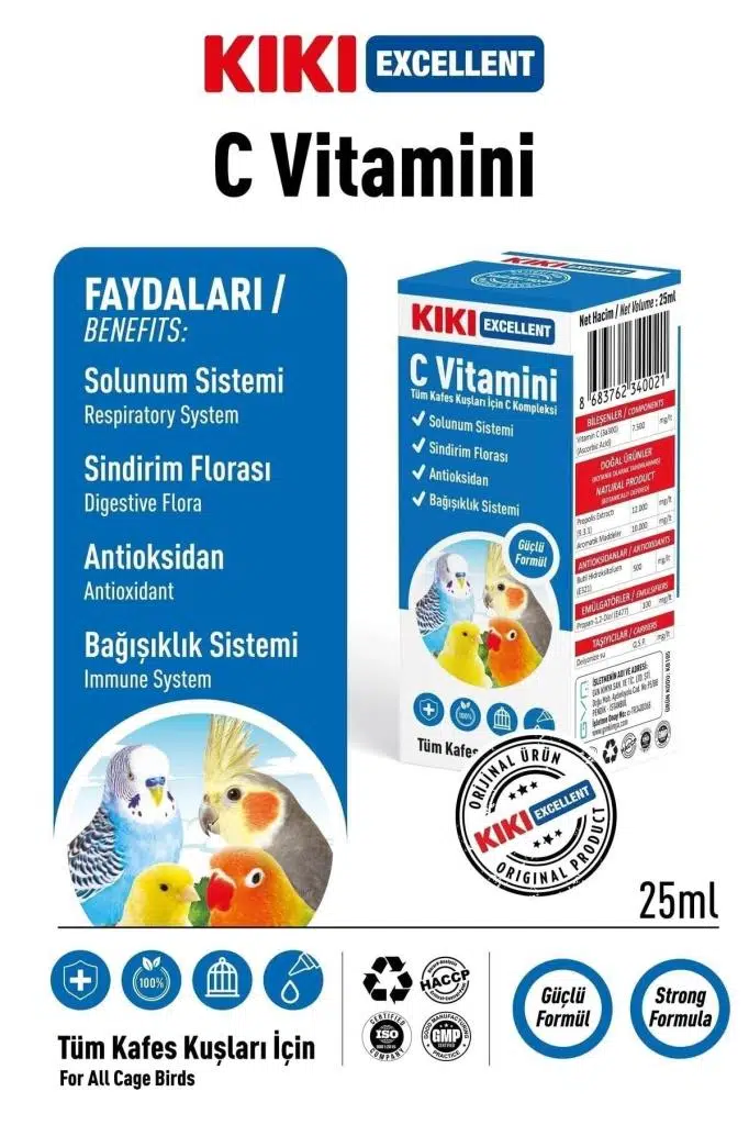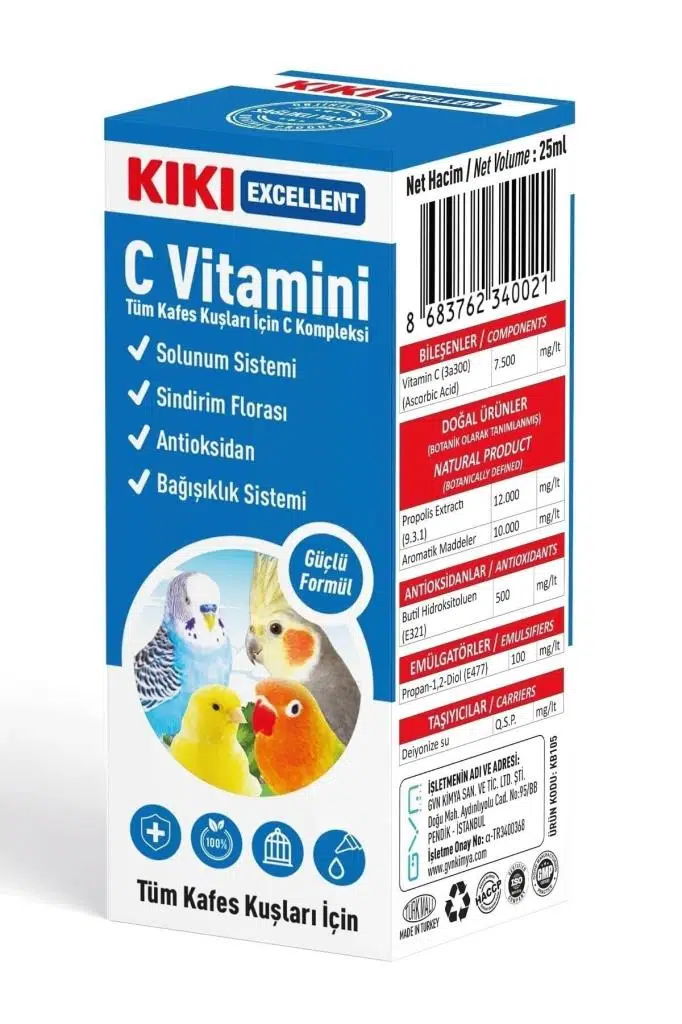 KIKI Excellent C Vitamini muhabbet kuşu, kanarya, papağan gibi tüm kafes kuşlarının beslenmelerinde C Vitamini ihtiyacıını karşılar. ; Antioksidan etkisi ile enfeksiyonlara karşı vücut direncinin gelişmesine katkıda bulunur. ; Bağışıklık sisteminin güçlenmesini sağlar. ; Kafeste yaşayan süs kuşlarının içme sularının 100 ml ine 1 ml KIKI Excellent C Vitamini katılarak gün aşırı kullanımı sağlanır. (1 ml yaklaşık 20 damladır. Orta boy suluk yaklaşık 100 ml su alır.) ; DEPOLAMA ŞEKLİ: Serin, nemsiz ve direkt güneş ışığı almayan yerlerde ambalajın ağzı açılmamış olarak depolayınız. ; UYARILAR: Çocukların ulaşamayacağı yerlerde muhafaza ediniz. ; Hedef hayvanlar dışında kullanmayınız. ; Kullanmadan önce çalkalayınız. ;