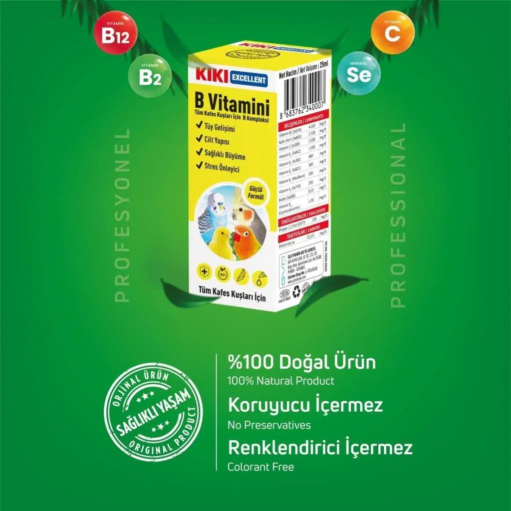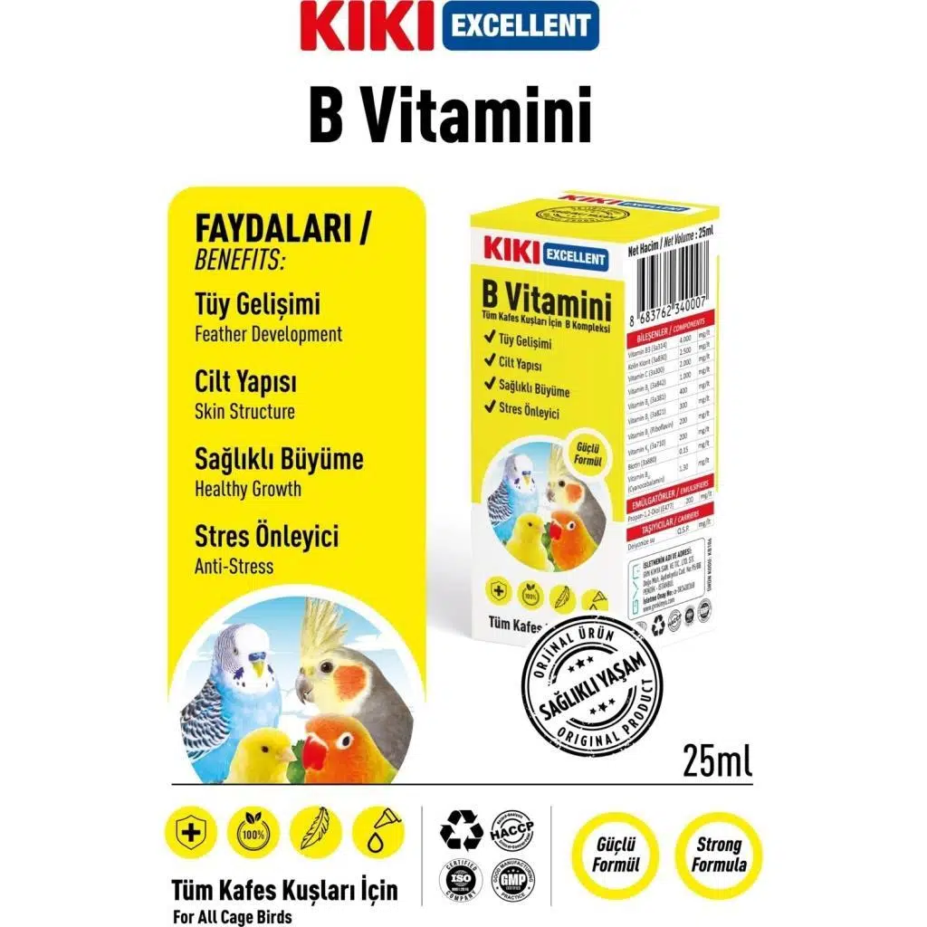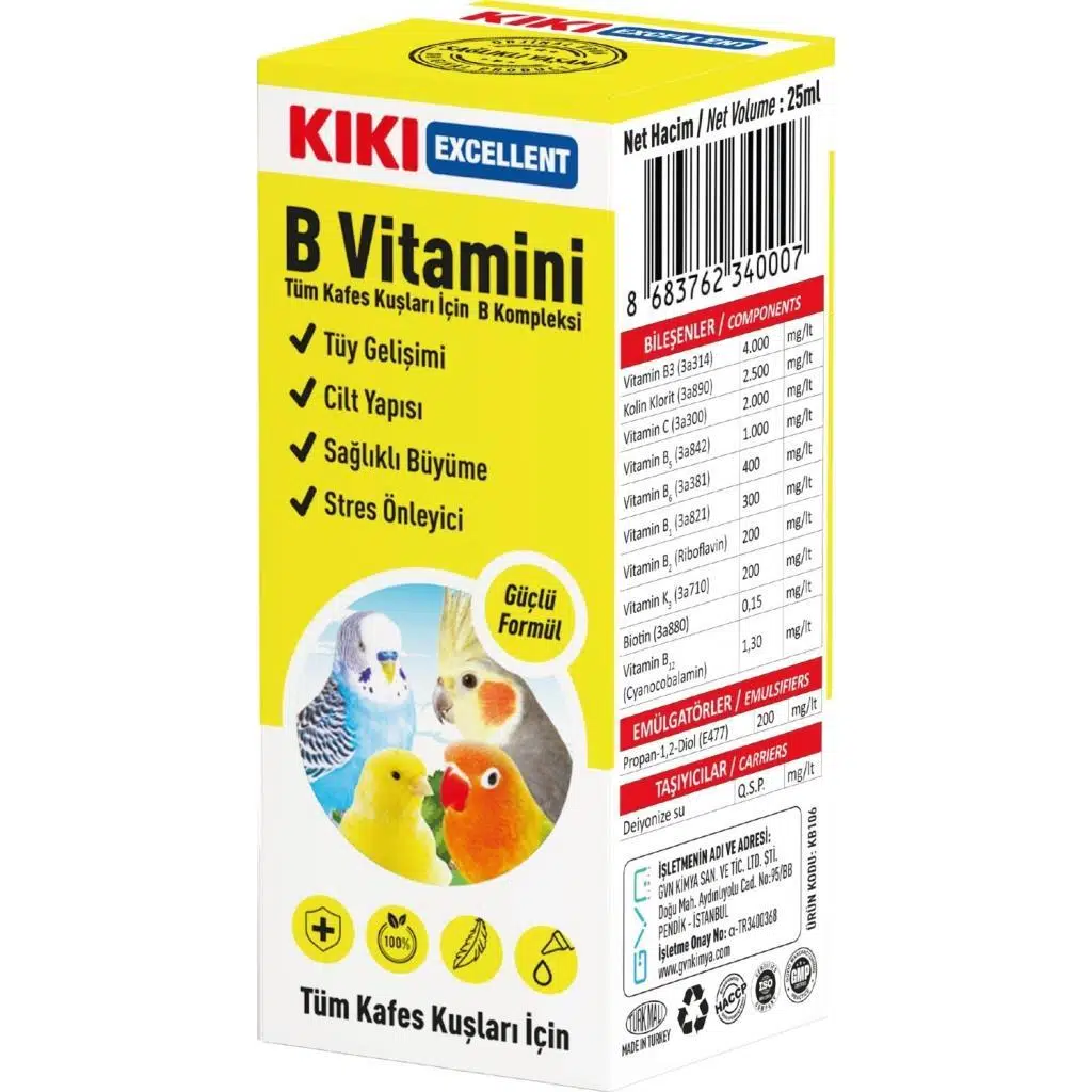 KIKI Excellent B Vitaminimuhabbet kuşu, kanarya, papağan gibi tüm kafes kuşlarının B vitamini ihtiyacını karşılar. Sinir sistemlerinin ve tüy yapısının güçlenmesine yardımcı olur. B vitamini eksikliğinden kaynaklanan kas felcinin önlenmesine katkıda bulunur. Kafeste yaşayan süs kuşlarının içme sularının 100 ml sine 1 mlKIKI Excellent B Vitaminikatılarak gün aşırı kullanımı sağlanır. (1 ml yaklaşık 20 damladır. Orta boy suluk yaklaşık 100 ml su alır.)