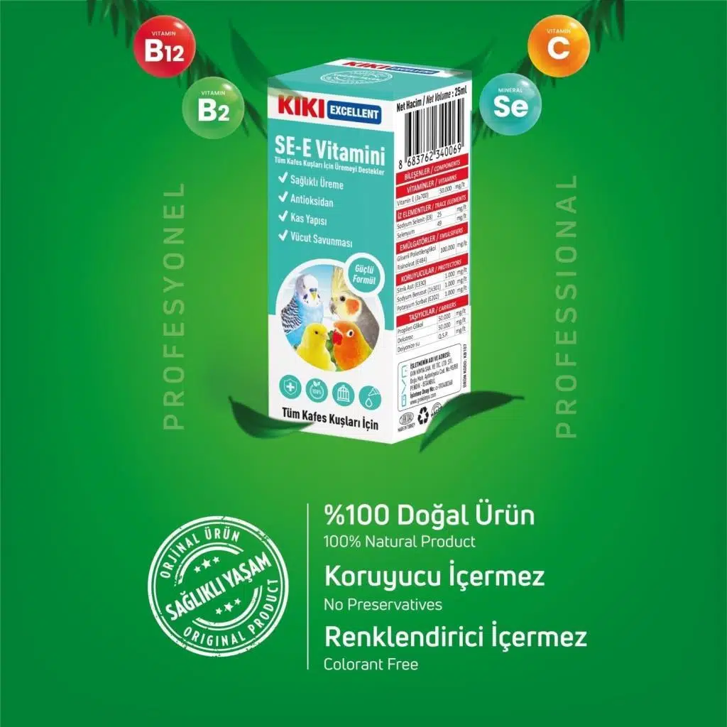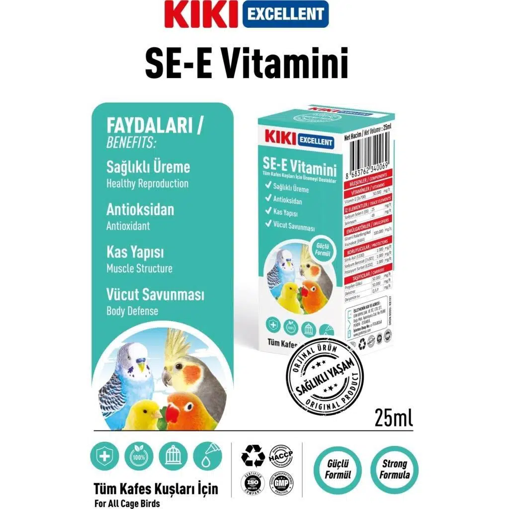 KIKI Excellent SE-E Vitaminimuhabbet kuşu, kanarya, papağan gibi tüm kafes kuşlarının Vitamin E ve Selenyum ihtiyacını karşılar. Tüm kafes kuşlarının üremelerinde, yumurtlamarın da ve yumurtadan civciv çıkışında yavruların hızlı büyüyüp gelişmesine yardımcı olur. Kafeste yaşayan süs kuşlarının içme sularının 100 ml ine 1 mlKIKI Excellent SE-E Vitaminikatılarak gün aşırı kullanımı sağlanır. (1 ml yaklaşık 20 damladır. Orta boy suluk yaklaşık 100 ml su alır.)