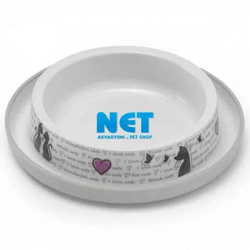 Kediler için, 15 x 12 x 3 cm ebatlarında, 210 ml hacminde, kedi desenli, mama ve su kabıdır.