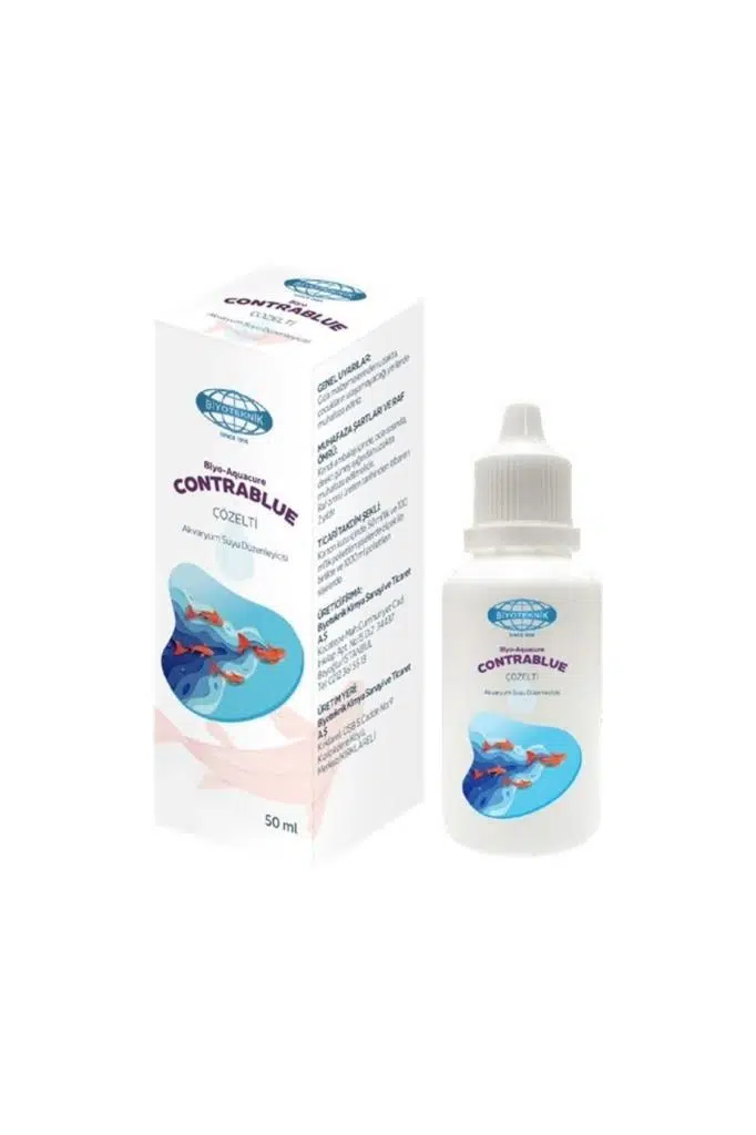 ÇÖZELTİ – AKVARYUM SUYU DÜZENLEYİCİSİ Kullanım Sahası: Akvaryumun temiz kalmasını sağlar. Hastalık etkenlerinin sağlıklı balıklara bulaşmasını önler. CONTRABLUE Çözeltisi; aynı zamanda oksijen taşıyıcı olup, balıkların kanındaki methemoglobini normal oksijene dönüştürür. Dolayısı ile balıkların, ortamda meydana gelebilecek nitrit ve/veya siyanidlerden zehirlenmelerini önler. Gerek hastalıklı balıklardan bulaşan ve gerekse şebeke sorunlarından gelen mantar, bakteri, protozoan gibi hastalık etkenlerini yok eder. Hastalık etkenlerinin sağlıklı balıklara bulaşmasını engeller. Kullanım Şekli Ve Dozu: •Uygulamadan önce aktf karbon filtresi çıkarılır. •İlk gün 20 litre akvaryum suyuna 5 ml biyo contrablue çözeltisi ilave edilir. Bu akvaryumun suyunun temizlenmesi için gerekli olan 3 ppm konsatrasyonunu sağlar. •2. ve 3. gün akvaryuma 2,5 ml contrablue çözeltisi ilave edilmeye devam edilir.(Aktif karbon filtresi bu sürede takılmaz) •3. Gün sonunda akvaryum suyunun yarısı boşaltılarak aktif karbon filtresi takılır. Bileşimi: 1 ml contrablue çözelti 12 mg methylene blue içerir. Koyu mavi renkte bir çözeltidir. Sadece hayvan sağlığında kullanılır. Muhafaza Şartları Ve Ömrü: Kendi ambalajı içinde, oda ısında direkt güneş ışığından uzakta muhafaza edilmelidir.