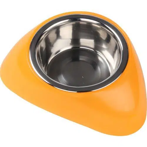 Kediler ve küçük boy köpekler için, ister mama kabı istenirse su kabı olarak kullanılbilen, çıkarılabilen çelik mama kabı ve turuncu renkli plastik standı bulunan, çelik mama veya su kabı