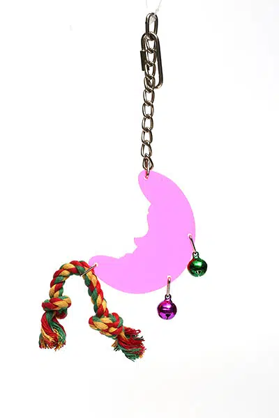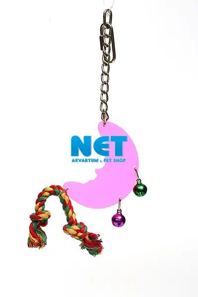 Akrilik İpli Aydede Papağanlar için, sıkılmadan vakit geçirebilecekleri, ortasında bulunan akrilik aydede aksesuara bağlı stres ipleri olan, 2 adet çıngıraklı, 13 cm uzunluğunda 7 cm eninde, kafes tellerine asılarak kullanılabilen, papağan oyuncağıdır.