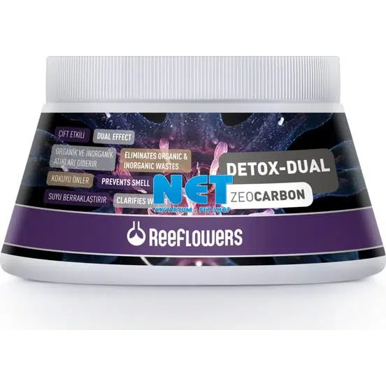 ReeFlowers Detox-Dual Zeo Carbon, doğal zeolit ve yüksek aktiviteye sahip aktif karbon içerir. Yem artıkları, dışkı, vb. kalıntıların çürümesi ve suda çözünmesi sonucu oluşan amonyak, hidrojen sülfat ve benzeri organik atıklar ile birlikte, ilaç tedavisi vb. sebeplerle oluşan inorganik toksik maddelerin tümünü sudan uzaklaştırmak amacıyla kullanılır. Suyu berraklaştırır, kokuyu önler ve su kalitesini arttırır. Mikro gözenekli yapısı ile faydalı bakteriler için yaşam alanı oluşturur, akvaryumdaki bakteri popülasyonunun artmasını sağlayarak biyolojik filtrasyonu güçlendirir. KULLANIM TALİMATI Medya reaktörü içerisinde, dış filtrede veya ürün ile birlikte verilen kese içerisinde su geçişinin hızlı olduğu bir bölümde kullanılmalıdır. Tatlı su ve tuzlu su akvaryumlarında kullanıma uygundur. Genel kullanımda ve sudaki sarı rengi gidermek için, her 100 lt için 90 ml (65 gr) kullanılmalı ve ayda bir yenilenmelidir. İlaç tedavilerinden sonra 100 lt için 180 ml (130 gr) kullanılmalı ve 3 gün sonra yenilenmelidir. Tek kullanımlıktır, yıkama, vb. işlemler sonucunda tekrar kullanılamaz.