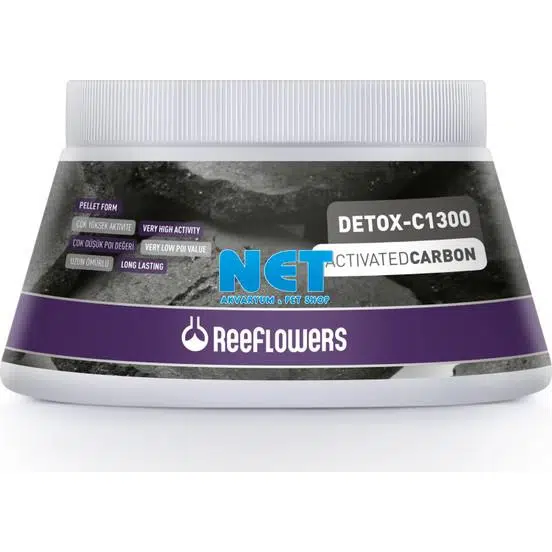 ReeFlowers Detox-C1300 Activated Carbon, çok yüksek aktiviteye sahip, üst kalite ve uzun ömürlü bir aktif karbondur. Suda çözünmüş organik ve inorganik atıkların ve toksik maddelerin akvaryum suyundan uzaklaştırılmasını ve suda oluşan sarı rengin giderilmesini sağlar. İlaç tedavisi sonrası sudaki zararlı etken maddelerin giderilmesi için kullanılır. Fosfat salınım seviyesi çok düşüktür (POI seviyesi sadece 0,6). Yosun oluşumuna sebep olmaz. Suyun Kristal berraklığında olmasını sağlar ve su kalitesini arttırarak canlılar için daha sağlıklı bir ortam oluşturur. KULLANIM TALİMATI Medya reaktörü içerisinde, dış filtrede veya ürün ile birlikte verilen kese içerisinde su geçişinin hızlı olduğu bir bölümde kullanılmalıdır. Kullanmadan önce durulanması tavsiye edilir. Tatlı su ve tuzlu su akvaryumlarında kullanıma uygundur. Genel kullanımda ve sudaki sarı rengi gidermek için her 100 lt için 60 ml (55 gr) kullanılmalı ve ayda bir yenilenmelidir. İlaç tedavilerinden sonra 100 lt için 120 ml (110 gr) kullanılmalı ve 3 gün sonra yenilenmelidir. Aktif karbon tek kullanımlıktır, yıkama, vb. işlemler sonucunda tekrar kullanılamaz. Ölçek kabı hacmi = 20 ml