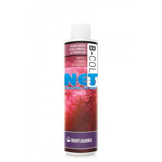ReeFlowers B-Color, mercanların renklenmesinde etkili olan pigment ve elementleri içerir. Canlılarda yaşamsal fonksiyonları hızlandırır, pH seviyesini tamponlar, büyümeyi tetikler, daha sağlıklı ve dirençli olmaları için gerekli ortamı sağlar. Canlıların daha parlak renklere sahip olmasını, özellikle pembe, mor ve mavi renklerin belirginleşmesini sağlar.