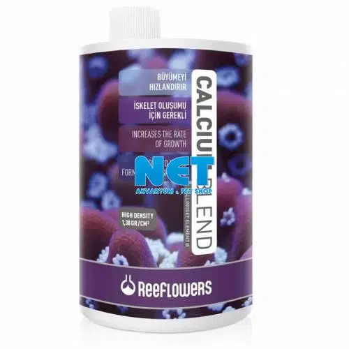 ReeFlowers Calcium Blend, yüksek yoğunlukta iyonik kalsiyum çözeltisidir. Mercan, istiridye ve benzeri canlıların iskelet oluşumu için gereklidir. ReeFlowers Calcium Blend, 1 lt de en az 150.000 ppm kalsiyum içerir. Resif akvaryumunda kalsiyumun 440-460 ppm aralığında olması, diğer fiziksel ve kimyasal gereklilikler sağlandığında mercanlar ve diğer iskelet yapısına sahip canlıların hızla büyümesini sağlar.