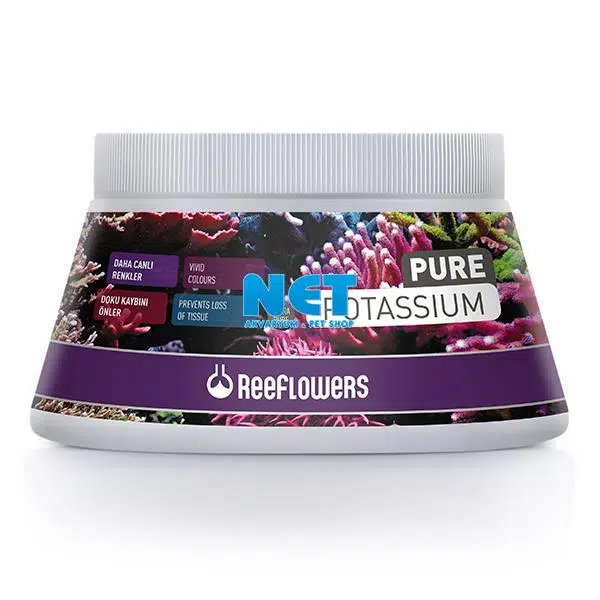 ReeFlowers Pure Potassium, yüksek saflıktadır ve 1 kg'da en az 500.000 ppm potasyum içerir. Potasyum, mercan iskeletinin önemli bir bileşenidir. Eksikliği halinde renklerde matlaşma ve doku kaybı gibi problemler görülür.