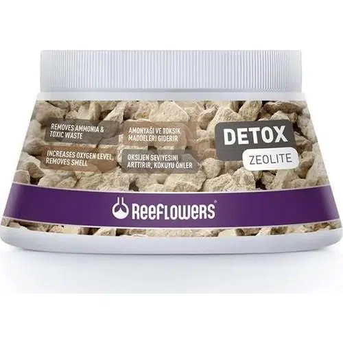 ReeFlowers Detox - Zeolit, volkanik lavların deniz suları ile reaksiyona girmesi sonucu oluşmuş doğal bir taştır. Yem artıkları, dışkı, vb. kalıntıların çürümesi ve suda çözünmesi sonucu oluşan amonyak, hidrojen sülfat ve benzeri toksik maddeleri hapseder, bulundukları sistemden uzaklaştırır. Canlılarda oluşan iç ve dış doku zedelenmelerinin iyileşme sürecini hızlandırır. Su kalitesini arttırır, oksijen seviyesinde artış sağlar.
