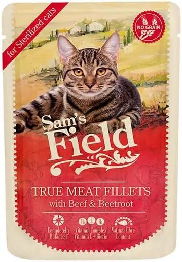 Kısırlaştırılmış kediler için tahılsız tam mama. İçerik: %85 et filetosu (w tavuk, %8 sığır eti), tavuk suyu, %4 pancar, mineraller, bezelye nişastası. Analitik bileşenler: ham protein %9,0, ham yağ %4,0, ham kül %2,0, nem %82,0, ham lifler %1,0, kalsiyum %0,2, fosfor %0,2, sodyum %0,1. Kg başına besin katkı maddeleri: D3 vitamini (E671) 250 mg, E vitamini (3a700) 150 mg, taurin (3a370) 500 mg, biotin (3a880) 0,3 mg, çinko (3b606) 15 mg, demir (E1) 12 mg, manganez (E5) 2,5 mg, potasyum iyodür (3b201) 0,8 mg, bakır (E4) 1 mg, L-metiyonin (3c305) 800 mg. Besleme kılavuzu: Oda sıcaklığında servis yapın. Sam’s Field pouchlar tam gıda olarak servis edilebilir. Kuru mama ile karıştırırken her birinin günlük miktarını buna göre azaltın. Kedinizin her zaman taze içme suyuna erişimi olduğundan emin olun.