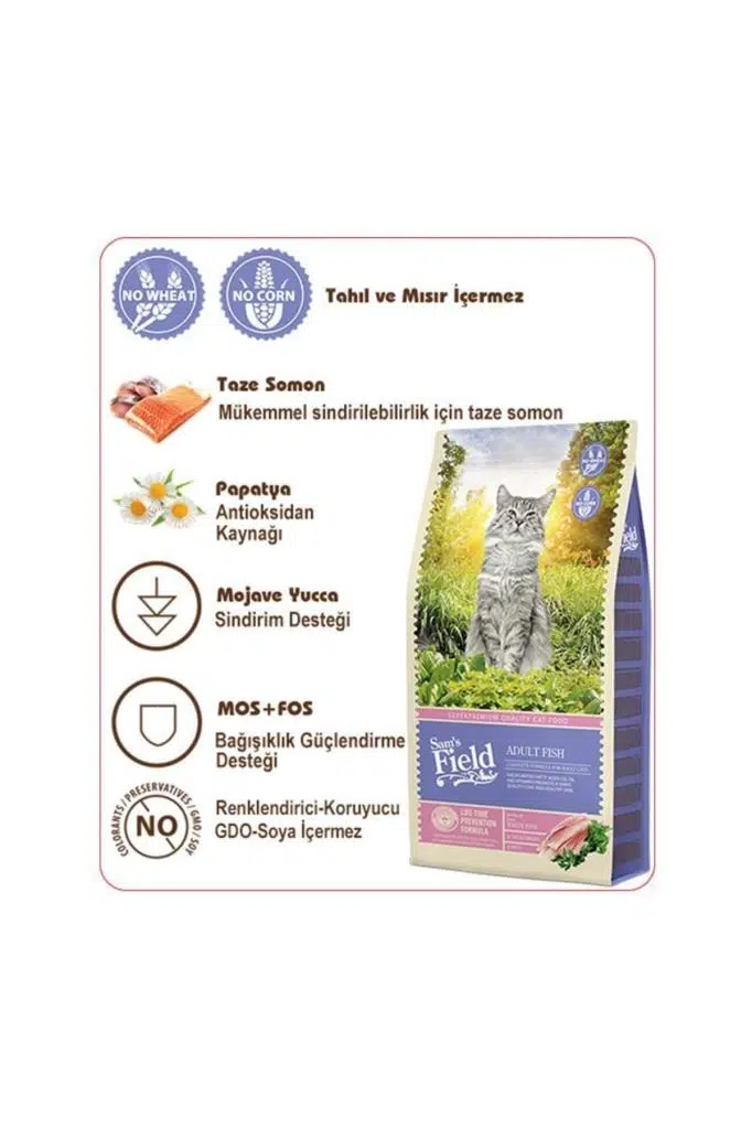 Sam's Field Balıklı Tahılsız Yetişkin Kedi Maması 2.5kg Gdo, koruyucu, renklendirici, mısır ve soya içermez. Ürün de gerçek balık eti mevcuttur.