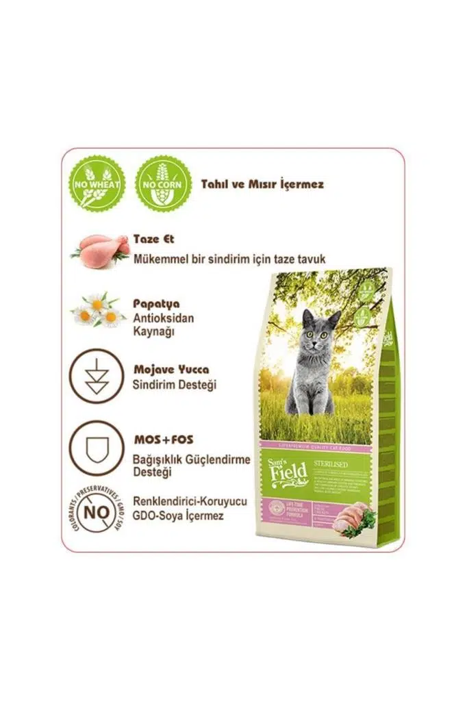 Sam's Field Sterilised Tavuklu Kısırlaştırılmış kedi maması 2.5 kg Gdo koruyucu renklendirici mısır ve soya içermez.
