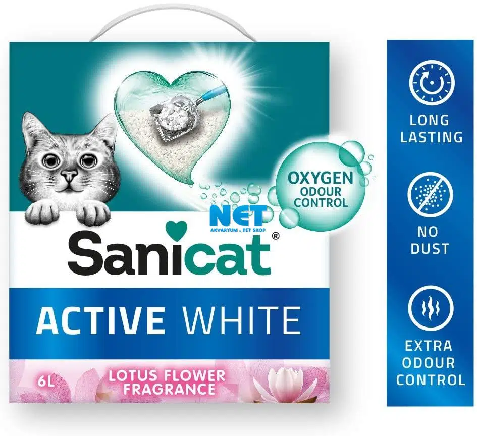 Sanicat Active White, lotus çiçeği kokulu ultra topaklaşma özelliğine sahip kedi kumu.