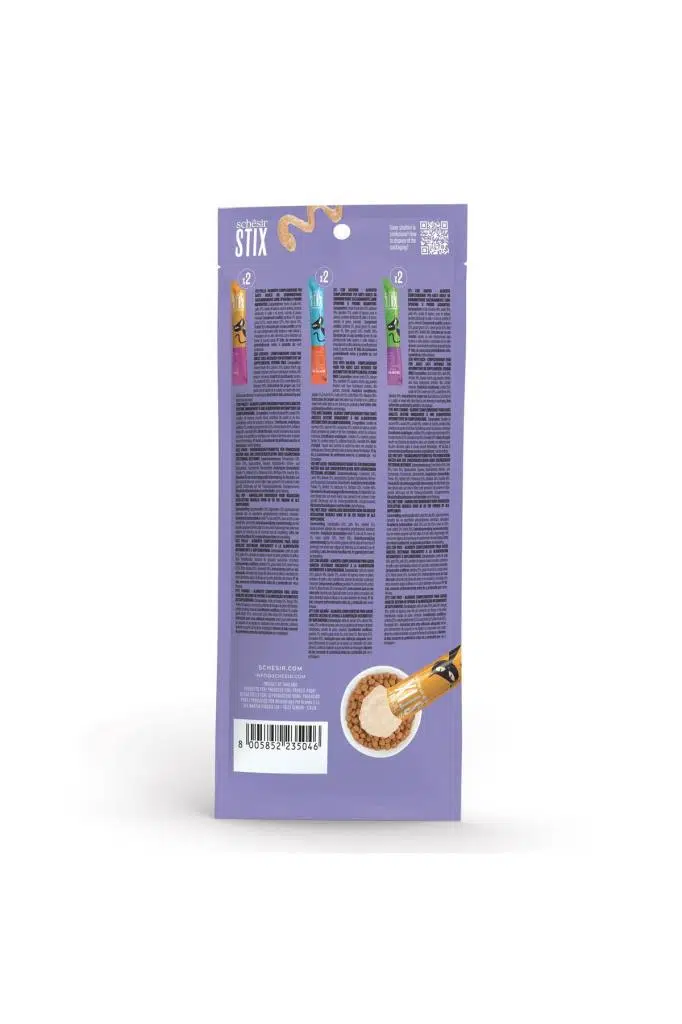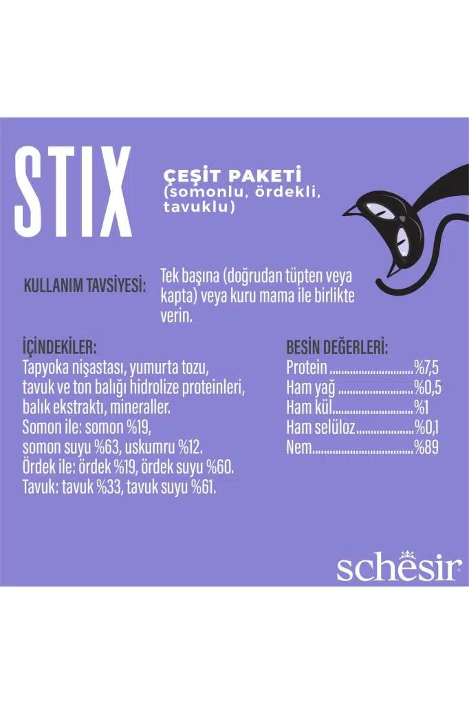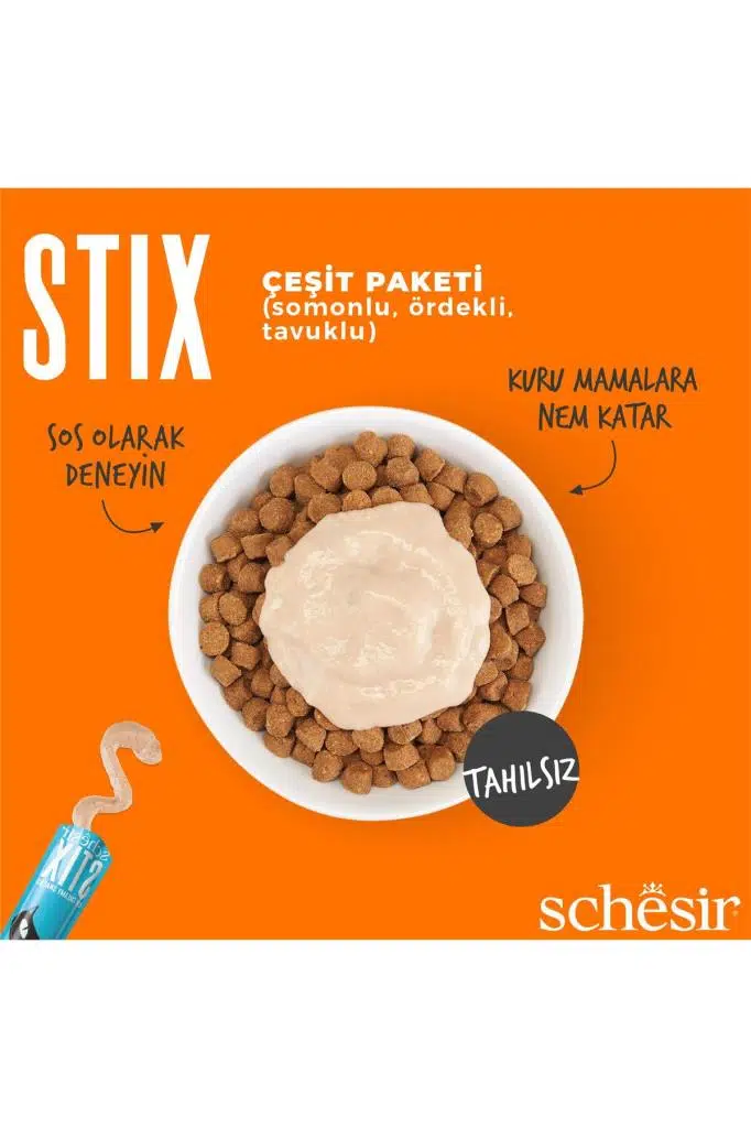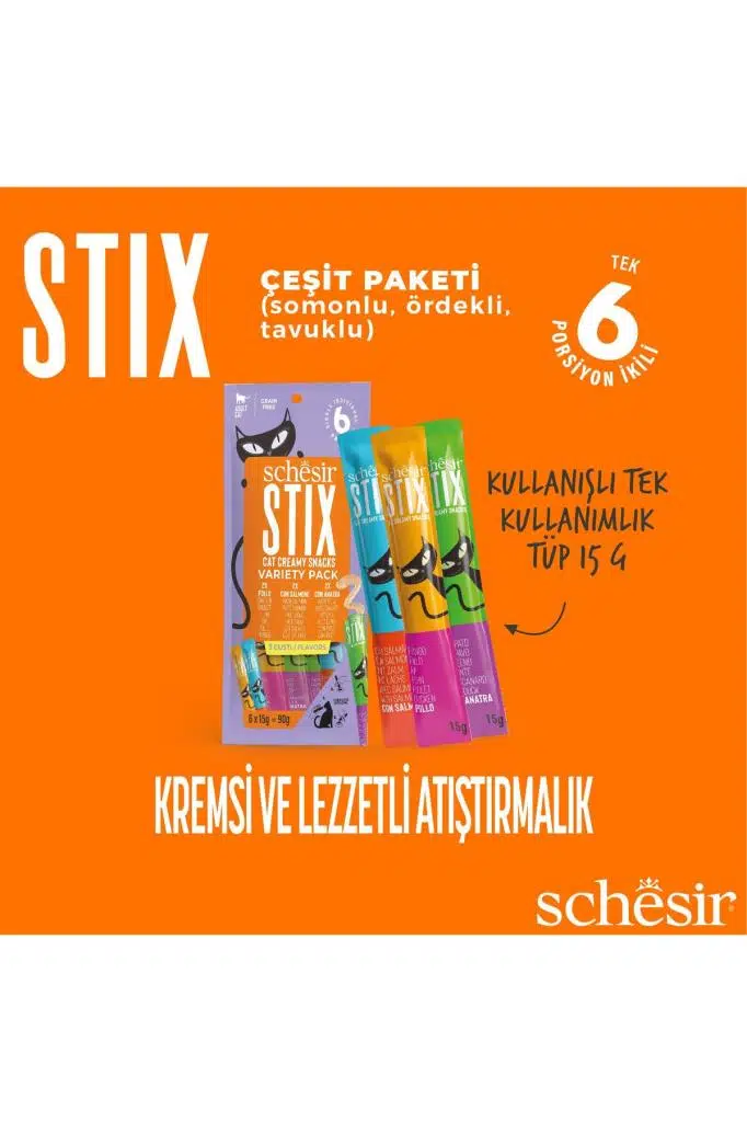 Ürün Adı: Schesir Stix Tavuklu & Somonlu & Ördekli Mix Krema Ödül Maması 6x15g Skt: 82/2026 Ödül Maması 6x15g Skt: 82/2026