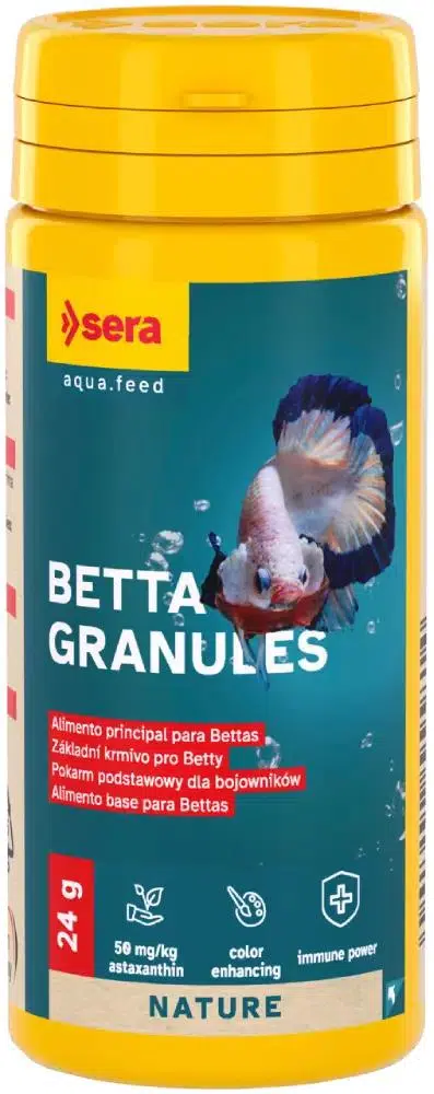 Betta Granules, Betta ve diğer labirent balıklar için boya ve koruyucu madde içermeyen, kolayca sindirilebilen temel yemdir.