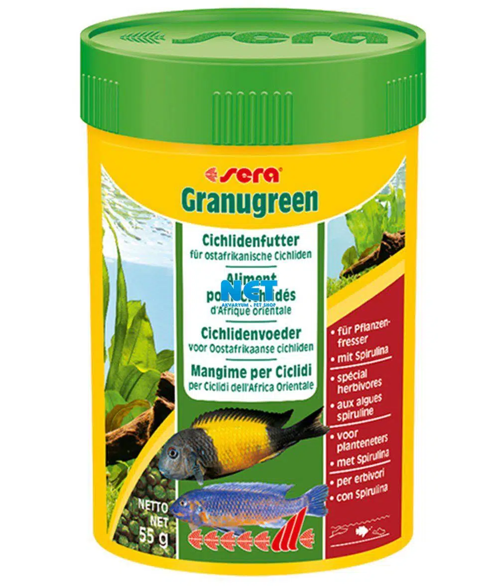 Sera Granugreen, doğu afrika çiklet türleri de dahil olmak üzere tüm otobur çiklet için özel olarak üretilmiş yüksek bitkisel içeriğe sahip kaliteli ve dengeli mini granül formda temel besin kaynağıdır.