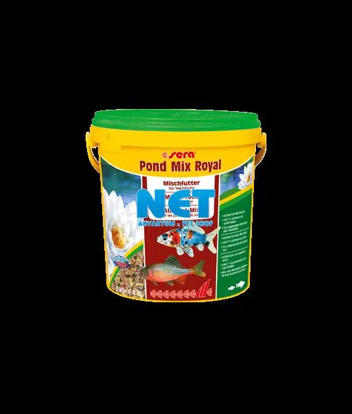 SERA POND MIX ROYAL 10 LT (2 kg) Sera Pond Mix Royal tüm havuz balıkları için doğru beslenme açısından önemlidir. Enerji ve vitamin yonünden zengin elementler 6 cm ve daha büyük balıklar için .dengeli ve sağlıklı beslenme olanakları sunar. Daha küçük balıklarda da kaliteli tahıl ürünleri, balık proteini ve balik yan ürünleri ile özenle hazırlanmış yemin içerdiği zengin vitaminler sayesinde sağlıklı, dengeli beslenme elde edilmiş olur. Doğal besin organizmaları (Gammarus), tüm havuz balıkları için protein yönünden zengin, besleyici elementlerdir.