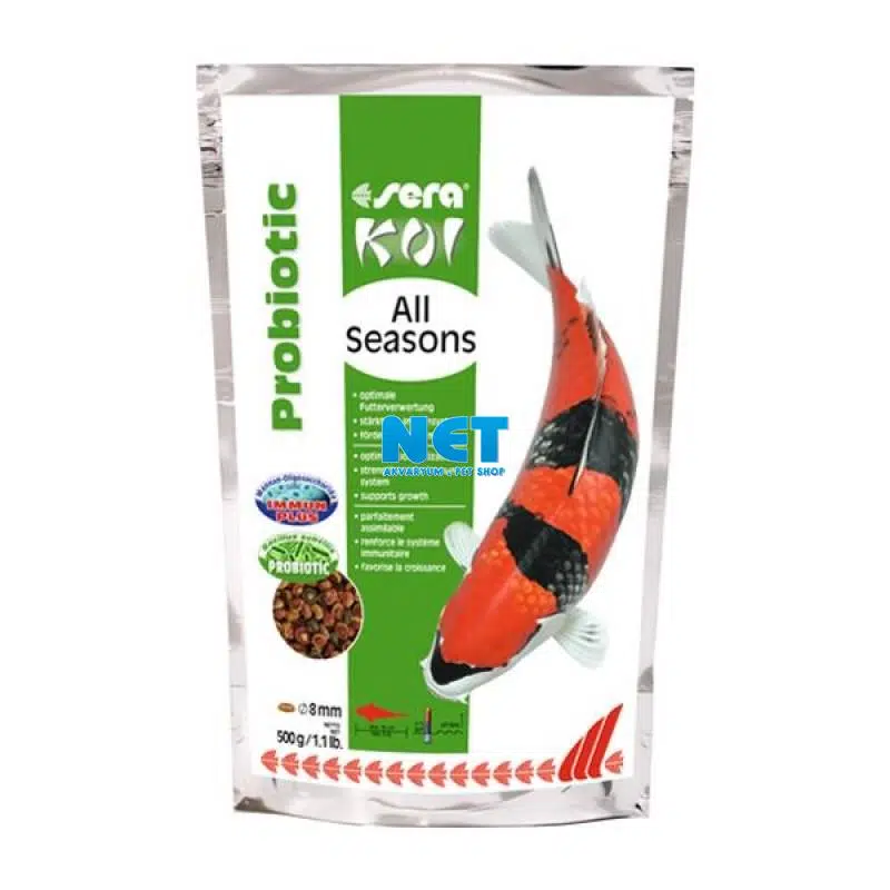 Sera Koi All Seasons Probiotic, Sera markası tarafından üretilen Koi besleme ürün gamındaki diğer bir çığır açan yeniliktir. Bu mükemmel Koi yemi ilk kez bağırsak florasını stabile eden Bacillus subtilis içerir. Yemin optimize edilmiş kullanılabilirliği hızlı ve kalıcı biçimde balığın gelişim ve sağlığını destekler.