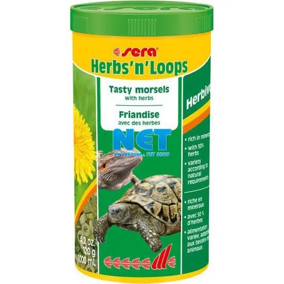 Sera Herbs’n’Loops, kara kaplumbağaları ve diğer otçul sürüngenler için özenle üretilmiş halkalar ve kurutulmuş çiçekler (P) karışımından oluşan gurme yemdir.