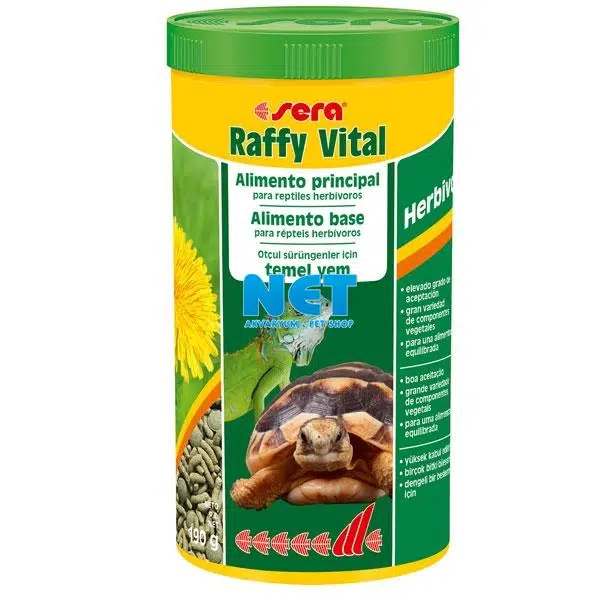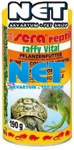 Sera Raffy Vital, kaplumbağa ve iguana için özel olarak formüle edilmiş, stick ve tablet olmak üzere iki farklı formda çeşitli bitki, alg ve sebze içeriği ile mükemmel bir bitkisel yemdir.