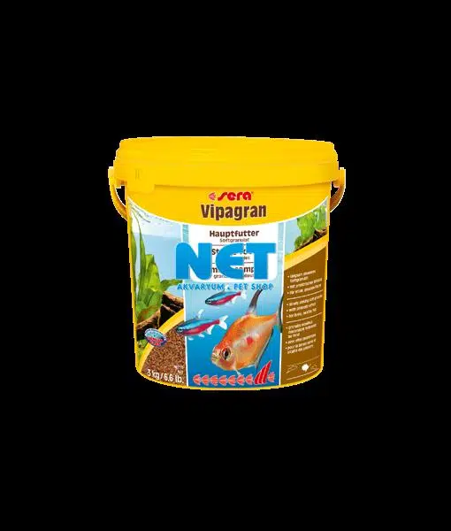 Sera Vipagran, çeşitli su seviyelerinden beslenen tüm süs balıkları için üretilmiş yüksek kaliteli ve dengeli içeriğe sahip taneli formda temel besin kaynağıdır.