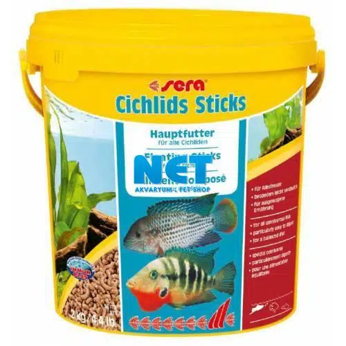 sera Cichlids Sticks, daha büyük, hepçil çikletler (bunlara birçok Güney Amerika türü de dahildir) ve diğer büyük balıklar için özenle üretilmiş çubuklardan oluşan temel yemdir. Yüksek miktarda ideal sindirilebilen protein ve değerli buğday tohumunun yanı sıra omega yağı asitleri sayesinde çubuk yemler oldukça lezzetli ve kolay sindirilebilirdir. Dengeli besin balıkların canlılığını ve sağlıklı gelişimini destekler. Yüzen çubuklar şeklini korur ve suyu kirletmez.