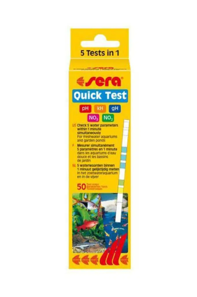 Sera Quick Test PH, KH, GH, NO2, NO3Sera Quick Test - Hızlı ve Kolay Test ŞeritiÜrün Kodu:;4960Sera Quick Test - Hızlı ve Kolay Test Şeriti ile rutin kontrol amacı ile veya ihtiyaca göre güvenlik sebebi nedeniyle akvaryum suyunuzu hızlı ve zahmetsiz bir biçimde kontrol etmeniz mümkündür.;Sera Quick Test, suyunuzdaki pH, kH, gH, NO2 ve NO3 değerlerini ölçmenizi kolaylaştırır. Şeriti suya batırın ve kısa bir süre bekleyin daha sonra çıkarın ve şemaya göre renk yoğunluğunu kıyaslamak sureti ile ilgili değeri okuyun.;Sera Quick Test, Özellikle akvaryum hobisine yeni başlayanlar için son derece etkili ve kolaylık sağlayan bir yardımcıdır. Yaklaşık değer ölçümünü kendiniz için yeterli bulmamanız durumunda Sera Sıvı Test'leri deneyebilirsiniz.;Öne Çıkan Özellikler;Hızlı ve Kolay çözüm;pH, kH, gH, NO2 ve NO3 ölçümleyebilme;Anlaşılır şema yapısı