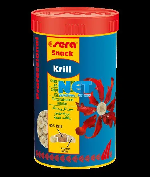 sera Krill Snack Professional, ortasında ` Krill uygulanmış halde, özellikle balıklarin optimal renk gelişimini destekler. Doğal astaksantenin yanı sıra Krill' in içerisindeki eser elementleri de ilaveten yumurtlamaya hazır olma durumu ve canlılığı destekler.