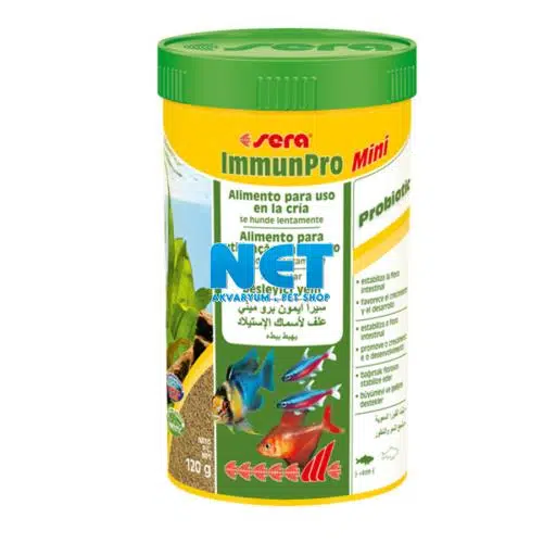 sera ImmunPro Mini 4 cm büyüklüğüne kadar olan tüm süs balıkları için ağır batan büyütme yemidir. Probiyotikler özel nazik bir işlemle yeme uygulanır ve küçük süs balıklarının bağırsak florasını stabilize eder. Besinden daha etkin faydalanabilme sayesinde su kirliliğinin azalmasını garantilerler. P oranının üzerinde yüksek protein yüzdesi sayesinde probiyotik ve diğer işlevsel MOS, Haematococcus ve Spirulina gibi malzemelerin eklenmesi sayesinde büyütme yemi hızlı büyüme, güçlü gelişim ve balıkların parlak renklenmesini garantiler.