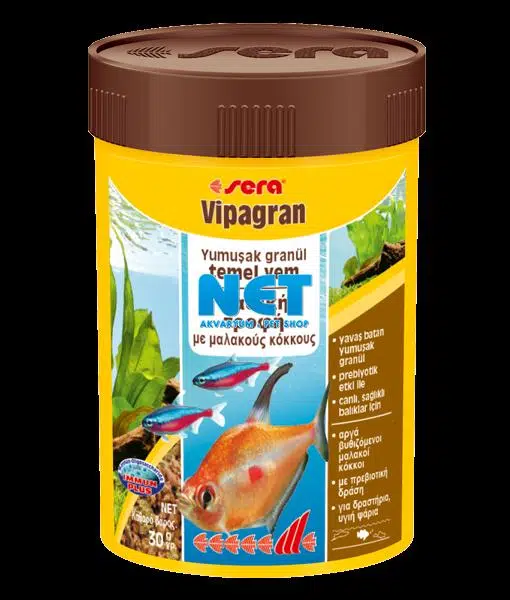 Sera Vipagran, çeşitli su seviyelerinden beslenen tüm süs balıkları için üretilmiş yüksek kaliteli ve dengeli içeriğe sahip taneli formda temel besin kaynağıdır.