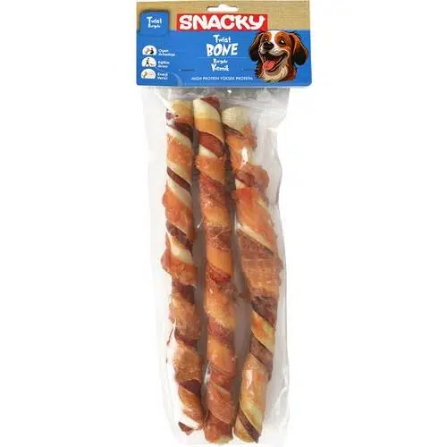 Snacky çiğneme kemikleri köpeklerin damak zevkine göre üretilmiş ödül kemikleridir. Köpeklerde içgüdüsel olarak bulunan kemirme ihtiyacını giderirken dişlerde tartar birikimi ve plak oluşumunu engeller. Çene yapısını güçlendirir ve dostunuzun eğlenceli vakit geçirmesini sağlar.