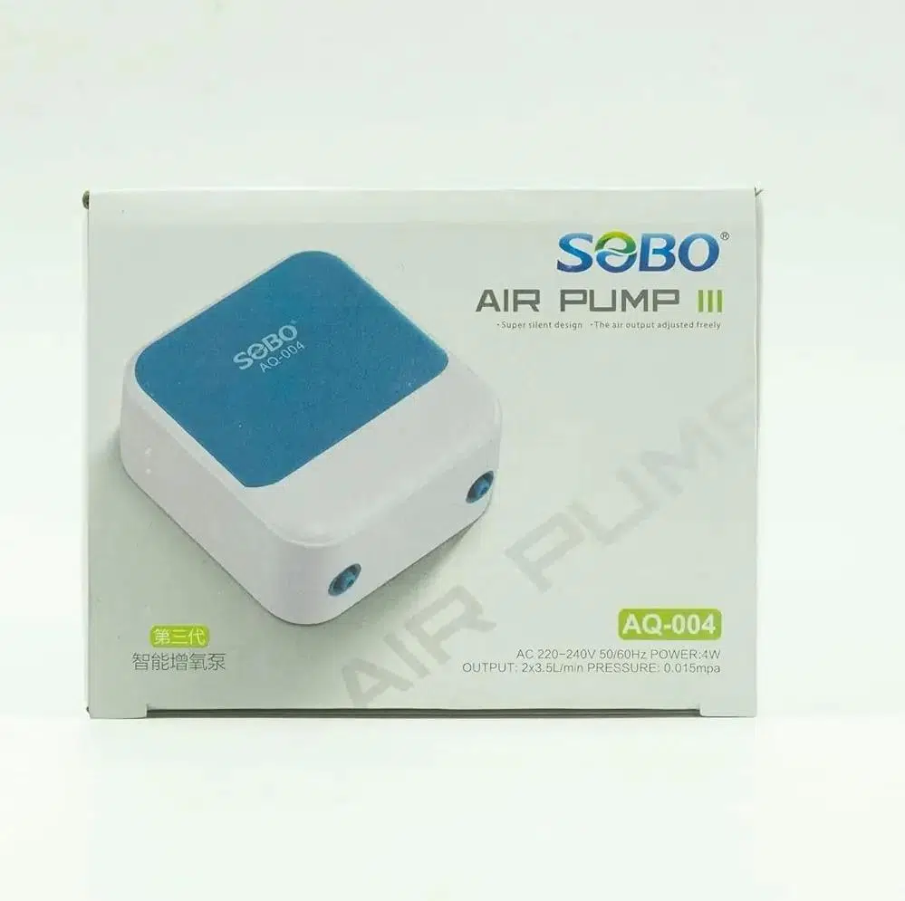 Sobo A-Q-004 Sessiz Hava Motoru, orta ölçekli ve birden fazla hava taşı kullanılan akvaryumlar için tasarlanmış,çift çıkışlı ve güçlü oksijenlendirmesunan bir hava pompasıdır. Dakikadaiki ayrı çıkıştan 3,5 litre havaüreterek akvaryum suyunda hem yüksek oksijen seviyesi hem de doğal bir su hareketi oluşturur.