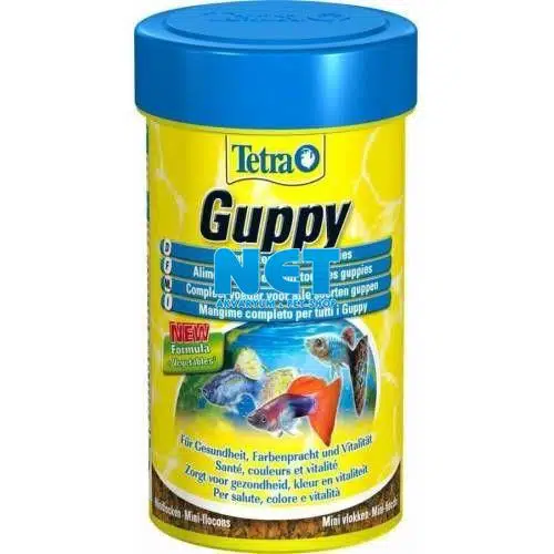 Tetra Guppy, özellikle Lepistes balıkları için, doğal renklerini koruyan ve daha canlı renklere sahip olmalarına yardımcı olan, karma akvaryumlar için uygun balık yemidir.