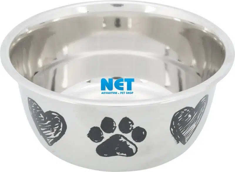 Paslanmaz çelik, dış tarafı vernikli, alt bölümünde mama ve su kabının kaymaması için kauçuk fitili bulunan köpek mama ve su kabıdır.