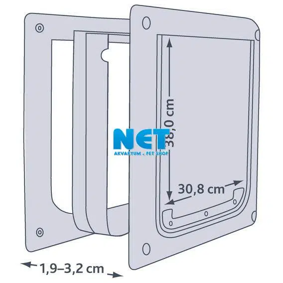 Sessiz açılıp kapanan, her mevsime uygun, özel contalı ve iki yönlü kitelenebilir, şeffaf, kolay ve çabuk monte edilebilir köpek kapısı. M - XL köpekler için uygundur. Tüm duvar ve kapı tipleri için uygundur. İç ölçüsü 33 x 40 cm, dış ölçüsü 39 x 45 cm, derinlik 19 - 32 mm dir. Flap kapı ölçüsü 30,88 x 38 cm'dir. Flap ın altında sağlam metal bar vardır.