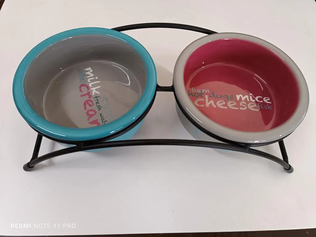 2 adet 0.3 lt hacminde ve ø12 cm çapında mavi/turuncu-mor seramik mama kabı ve su kabı setidir.Fırın boyalı ve kaymaz ayaklı metal standı vardır.